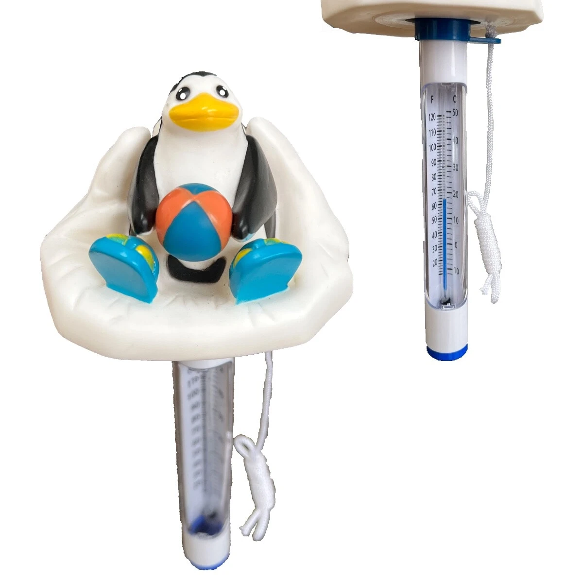 Attached string to tie to pool steps or hot tub filter housings, making sure the penguin doesn’t get away!