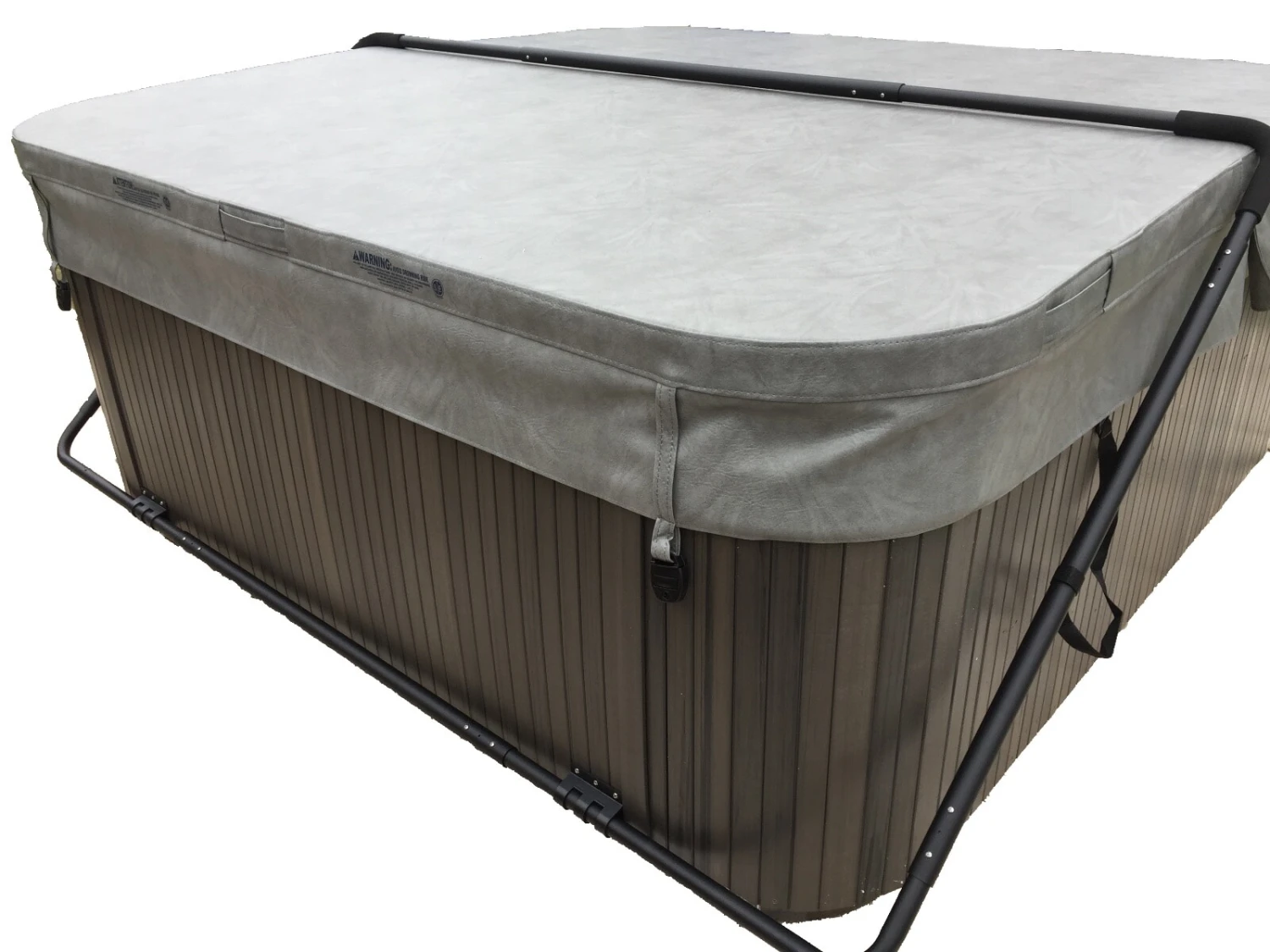 This high quality cover lifter will make putting your spa cover on and off EASY! Just fold into the middle and pull back, Anyone can do it! As little as 18” clearance is needed behind the spa, fits up to 8′ hot tubs. The design is attractive, sleek, low-profile and ergonomic. compliments any spa. No more dragging the cover and ripping it to bits. Keep the cover in great condition. Make your cover last longer. This Cover Lifter is made of black powder coated aluminium and comes with screw caps and bolt caps to finish that plush hot tub look! The cover lifter has no moving parts and comes with a UV-resistant catch strap, making it totally trouble free. Made of top quality aluminium, reducing the bending, twisting and torquing of its cheaper look-alikes. Simply attach the covermate brackets onto the bottom of your hot tub or directly onto your decking. This comes with the added bonus of hidden screw holes or no screws into your hot tub at all! The lifter has minimal strain on your spa cabinet, as all the weight can be put onto decking or the strong bottom rim of your hot tub. Simply build the frame, attach the brackets, attach the straps onto your cabinet and boom, you are no longer dragging your hot tub cover around, Easy!