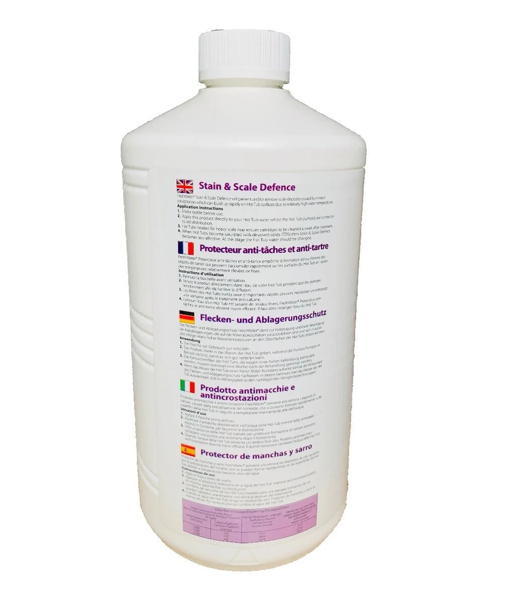 Hot Spring Freshwater Stain & Scale Defence will prevent and/or remove scale deposits caused by mineral precipitation which can build up rapidly on hot tub surfaces due to relativley high water temperatures and imabaanced PH.